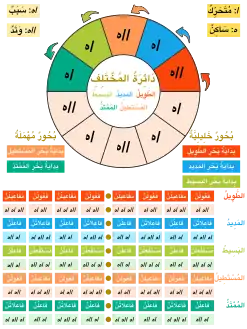 | سبب التسمية | سُمِّيَت هذه الدائرة بهذا الاسم لاختلاف تفعيلاتها، بين خماسية (فَعُولُنْ وفَاعِلُنْ) وسباعية (مَفَاعِيْلُنْ وفَاعِلاتُنْ ومُسْتَفْعِلُنْ) | ||||||