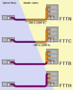 | 3 | FTTC | الكابينة Cabinet | الألياف البصرية تصل الكابينة تشبه إلى حد بعيد FTTN، ولكن كابينة الشارع هي أقرب إلى أماكن العمل للمستخدم. | >300 | 3 |