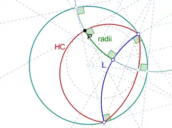 إذا كان خطاً مستقيماً، فإنّ لكل نقطة ليست على الخط المستقيم، بالإمكان إنشاء دائرة فائقة تأخذ كل النقاط من على نفس الجهة من بالنسبة لـ وبمسافةٍ عمودية للمستقيم تبعد البعد نفسه عن . يُسمَّى الخط : محور، مركز أو قاعدة الدائرة الفائقة. وجميع الخطوط المتعامدة للمحور تكون متعامدةً أيضاً للدائرة الفائقة. المسافة المشتركة بين النقاط على الدائرة تُسمّى دائرة نصف قطرها.[2]