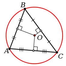 مركز الدائرة المحيطة بمثلث هي ذاتها نقطة تقاطع المنصفات العمودية لأضلاع المثلث.