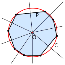 الدائرة المحيطة C ذات المركز O تحيط بالمضلع P