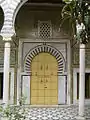 واحد من الأبواب المزين بالأقواس و الزخرفة الأندلسية بالأبيض و الأسود.