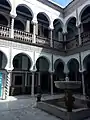 يبدأ القصر بمدخل طويل نسبيا يُسمّى "السّقيفة" والذي يؤدي إلى الفناء الرئيسي القصر "صحن القصر"، وهو مكان مفتوح على الهواء يتوسّط البناء في قلبه نافورة، وتحمل طوابق القصر الثلاث أعمدة رخامية سميكة مُلتوية الفناء محمي بقباب متراصة وموزعة بمنافذ زخرفية تشكل مقاعد للنوافذ. وهناك أيضا مدخل ثاني للقاعة التي تطل على بابين مؤطرين بالرخام. هذا يربط السقيفة الرئيسية التي يستخدمها الزوار لدخول الفناء الداخلي. ويحيط بمركز الشقق السكنية أروقة مدعومة بأقواس ترتكز على أعمدة رخامية وتتميز بالبلاط المزخرف. يتم دعم الأسقف بعوارض خشبية تغطيالأروقة في الطابق الأرضي والطابق الأول من القصر.[11]