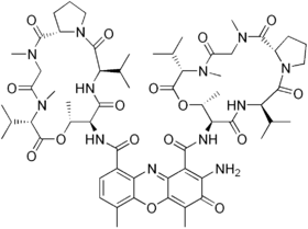 | مرادفات | Actinomycin D 2-Amino- 4,6-dimethyl- 3-oxo- 3H-phenoxazine- 1,9-dicarboxylic acid bis- [(5,12-diisopropyl- 9,13,16-trimethyl- 4,7,11,14,17-pentaoxo- hexadecahydro- 10-oxa- 3a,6,13,16-tetraaza- cyclopentacyclohexadecen- 8-yl)- amide] |
