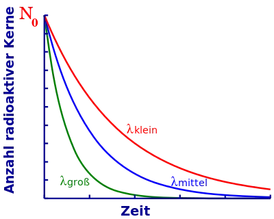 وتعطينا تلك المعادلة الأسية عدد الأنوية (N(t التي لم تتحلل بعد مرور الزمن t من مجموع أنوية الذرات N_0 الكلي عند البداية (عند t = 0).