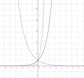 ![]() تمثيل الدوال الأسية في جملة الإحداثيات الديكارتيّة، فاللون الأسود ذو الأساس (e)، واللون الأحمر ذو الأساس 10، واللون الأزرق ذو الأساس 12، نلاحظ أن جميع المنحنيات قطعت النقطة (0، 1). تمثيل الدوال الأسية في جملة الإحداثيات الديكارتيّة، فاللون الأسود ذو الأساس (e)، واللون الأحمر ذو الأساس 10، واللون الأزرق ذو الأساس 12، نلاحظ أن جميع المنحنيات قطعت النقطة (0، 1). | |