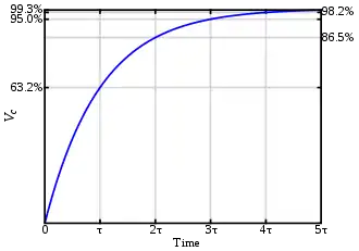 - يعطينا الشكل المجاور الشكل المميز للدالة الأسية للأساس e. وطبقا لها تتغير الشحنة الكهربائية الواردة على المكثف مع الزمن حتى يمتلئ تماما.