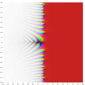 دالة إيتا لدركليه في المستوى العقدي. لون نقطة ما يعطي قيمة الدالة . الألوان القوية تعني قيما قريبة من الصفر وشدة اللون تعطي العمدة.