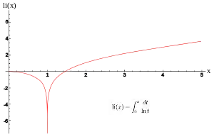 هنا، يشير ln إلى اللوغاريتم الطبيعي . الدالة 1/ln(t) لها نقطة تفرد عند t =1 ، والتكامل من أجل x > 1 يجب أن تفسر على أنها قيمة رئيسية لكوشي.