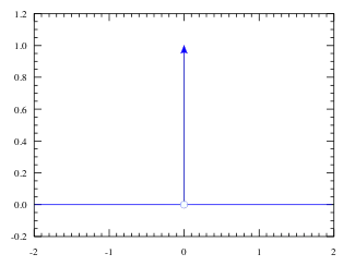 تمثيل لدالة ديراك بمستقيم يعلوه سهم. The height of the arrow is usually used to specify the value of any multiplicative constant, which will give the area under the function. The other convention is to write the area next to the arrowhead.