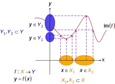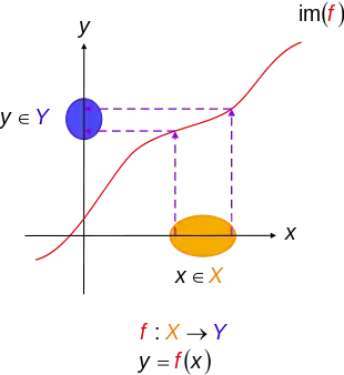 دوال متباينة. تفسير هندسي في نظام إحداثي ديكارتي, المعرفة بالتطبيق f : X → Y, حيث y = f(x), X = مجال دالة, Y = مدى دالة, و im(f) يرمز إلى صورة of f. Every one x في X maps to exactly one unique y in Y. الأجزاء المدورة من المحورين تمثل domain و range sets – في توافق مع المخططات المستعملة في التعريف أعلاه.