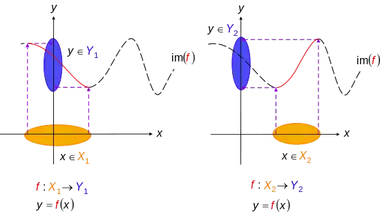 Making functions injective. الدالة السابقة f : X → Y can be reduced to one or more injective functions (say) f : X1 → Y1 و f : X2 → Y2, shown by solid curves (long-dash parts of initial curve are not mapped to anymore). Notice how the rule f has not changed – only the domain و range. X1 و X2 are مجموعتان جزئيتان من X, Y1 و Y2 هما مجموعتان جزئيتان من R: for two regions حيث الدالة الأولى can be made متباينة so that one domain element can map to a single range element. هكذا, only one x في X maps to one y في Y.
