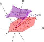 الدوال f(x1, x2, ..., xn) لـ n متغير، مرسومة كرسومات بيانية في الفضاء ℝn + 1. المجالات هي المناطق n-الأبعاد الحمراء، والصور هي منحنيات n-الأبعاد ذات اللون الأرجواني.