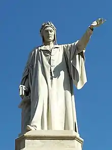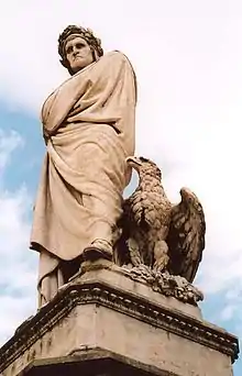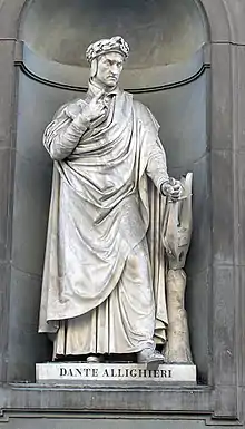 دانتي أليغييري Dante Alighieri (وبالإيطالية تنطق [ˈdante aliˈɡi̯ɛ:ri][7]) (فلورنسا 1 يونيو 1265 - رافينا 14 سبتمبر 1321) ويعرف عادة باسم دانتي وهو شاعر إيطالي من فلورنسا، أعظم أعماله: الكوميديا الإلهية المكونة من ثلاثة أقسام الجحيم، المطهر والفردوس، يعتبر البيان الأدبي الأعظم الذي أنتجه أوروبا أثناء العصور الوسطى، وقاعدة اللغة الإيطالية الحديثة. فهي واحدة من الأعمال الرئيسية لعملية الانتقال من العصور الوسطى إلى عصر النهضة الفكر. وتعتبر تحفة من الأدب الإيطالي وواحدة من قمم الأدب العالمية.[8][9] ومعروف دانتي في الأدب الإيطالي بالشاعر الأعلى. ويسمى أيضا دانتي "أبو اللغة" الإيطالية. وقد كتب جيوفاني بوكاتشيو (1313-1375) أول سيرة ذاتية لدانتي، في تراتاتيلو في مرتبة الشرف لدانتي.