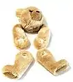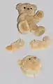 - "A STEIFF HARLEQUIN TEDDY BEAR, jointed, half red and half blue mohair, one blue and black and one brown and black glass eye, black stitching, yellow felt pads and FF button, circa 1925 --13½in. (34cm.) high (small bald spot below right ear, some fading mainly to the blue, blue eye cracked, patch to right pad and some general wear) Christie's". مؤرشف من الأصل في 16 يونيو 2018. اطلع عليه بتاريخ 12 أكتوبر 2010.