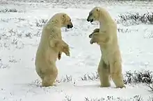 ألتقط أحد المصورين، عام 1992، عدّة صور تعتبر اليوم من أكثر الصور تداولا وانتشارا لهذه الحيوانات، وهي تظهر دبا قطبيا يلاعب كلب إسكيمو كندي يبلغ عشر حجمه فقط.[63][64] وكان الحيوانان يتصارعان لهوا كل عصر نهار على مدى عشرة أيام من دون سبب ظاهر، على الرغم من أنه يُحتمل أن يكون الدب يُحاول إظهار وديّته للكلب حتى يسمح له الأخير بمشاركته طعامه.[63] يُتبر هذا النوع من التفاعل الاجتماعي نادر جدا؛ إذ أن الدببة القطبية غالبا ما تتصرف بعدائية تجاه الكلاب.[63]