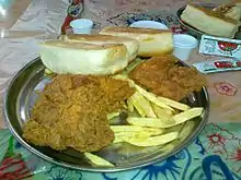 وجبة دجاج مقلي، يغلف بالطحين أو العجين ويقلي في الزيت.
