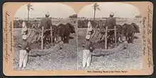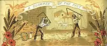 صورة للودوفيك باساراب حيث تتم عملية درس الحنطة ("الدراسة")، ومبينة الفلاحين باللباس الروماني حول حاصدة مركبة