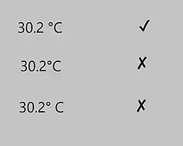وفقًا لمعايير المكتب الدولي للأوزان والمقاييس، تسبق القيمة العددية وحدة القياس دائمًا في الكتابة، كما يجب ترك مسافة فاصلة بينهما. توضح الصورة التالية طريقة الكتابة الصحيحة:[19]