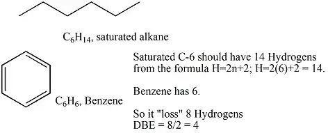 حيث C = عدد ذرات الكربون و H = عدد ذرات الهيدروجين و X = عدد ذرات الهالوجين وعدد ذرات النتروجين. [3] والتي تعطي قيمة مكافئة، مع العلم أن الأكسجين لا يؤخذ بعين الاعتبار في الحساب لأنه ثنائي التكافؤ (2 − 2 = 0).