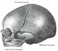 عرض جانبي للجمجمة. يشير السهم إلى الدرز الإكليلي .