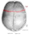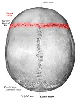 ![]() منظر علوي للجمجمة. الدرز الإكليلي مبين باللون الأحمر. منظر علوي للجمجمة. الدرز الإكليلي مبين باللون الأحمر. | |