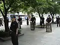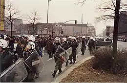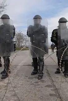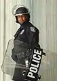 و يمكن للشرطة باستعمال الدروع تكوين حاجز أمام المحتجين بتصفيفها بجانب بعضها.