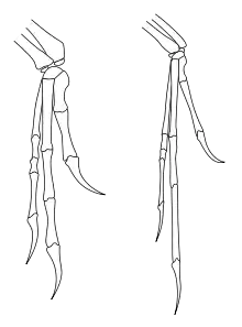 كانت قصبة الرجل طويلة ومائلة إلى الخلف ولكنها في "الأونينلاجيين " كانت قائمة عمودية. .[5] وكان الفخذ أقصر 10 % - 20% من قصبة الرجل ماعدا في الأخيلورابتور الذي كان فخ1 ه أطول من القصبة. وكان وسط القدم فصيرا وعظامها قوية وتقريبا متساوية الطول بينما كانت العظمتان الأولى والخامسة لوسط القدم قصيرتين. وكانت السبابة الثانية ذات مخلب مقوس حاد كبير. ويختلف طول هذا المخلب من جنس لآخر اختلافا كبيرا - فكان للداينونيخوس والفيلوكيرابتور كبيرة بطريقة فظيعة، فكانت "للأداصور " صغيرة جدا.