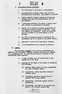 بحسب إعلان بوتسدام فإن "على اليابان إزالة كامل المعوقات..."، فإن الجنرال ماكارثر القائد الأعلى لقوات التحالف أمر عناصره بوضع مسودة للدستور الجديد بعد أن كان من الصعب على قادة اليابان التفكير بدستور قد يكون بديلاً عن دستور ميجي. على الرغم من أن كتاب مسودة الدستور الجديد لم يكونوا يابانيين إلا أنهم أخذوا بعين الاعتبار دستور ميجي ومطالب الدستوريين اليابانيين وآراء القادة السياسيين، وتم عرض مسودة الدستور على المسؤولين اليابانيين في 13 فبراير 1946، الذي أعلنت عنه الحكومة في 6 مارس من ذات العام، وفي 10 أبريل عقدت انتخابات مجلس النواب الذي من المفترض عليه أن يناقش الدستور المقترح وكانت أول انتخابات عامة يسمح فيها للنساء بالتصويت.