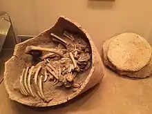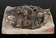 يرجع تاريخ الدفن لدى البشر غير المختلف عليه حتى الآن إلى ما يقرب من 130000 عام. لا تزال الهياكل البشرية ملطخة بـالمغرة الحمراء التي تم اكتشافها في كهف سكول (Skhul) في قافزيه (Qafzeh)، إسرائيل. ولا تزال هناك مجموعة مختلفة من أمتعة المقبرة في الموقع، من بينها الفك الأسفل للخنزير البري في أحد أزرعة الهياكل العظمية.[4]