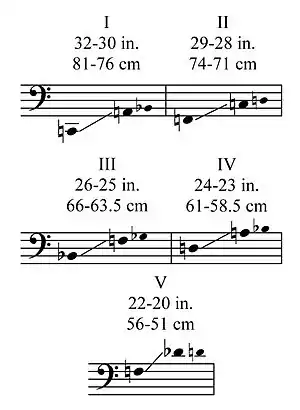 تتكون المجموعة القياسية للدفيات (تسمى أحيانًا وحدة التحكم) من أربعة براميل، أقطارها هي 32 بوصة (81 سـم) تقريبًا 32 بوصة (81 سـم) و29 بوصة (74 سـم) و26 بوصة (66 سـم) و23 بوصة (58 سـم).[10] يتراوح نطاق هذه المجموعة من D <sub id="mw6w">2</sub> إلى A <sub id="mw7A">3</sub> تقريبا. يمكن لعب الغالبية العظمى من الأوركسترا باستخدام هذه الطبول الأربعة. ومع ذلك، فقد كتب المؤلفون المعاصرون للنطاقات الموسعة. يكتب إيغور سترافينسكي تحديدًا عن تيمبانو بيكولو في فيلم "طقوس الربيع". الطبول بيكولو عادة ما يكون قطرها 20 بوصة (51 سـم) ويمكن أن تصل إلى C 4.