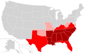 اللون الأحمر الداكن يشير إلى الولايات التي غالبا يطلق عليها المصطلح الحديث ديكسي، أما اللون الأحمر - أحيانا (انظر جنوب الولايات المتحدة لتعريف التعداد السكاني الأميركي)، بينما الأحمر الفاتح - تشملها أحيانا بسبب الروابط التاريخية مع الجنوب.[1][2][3][4]