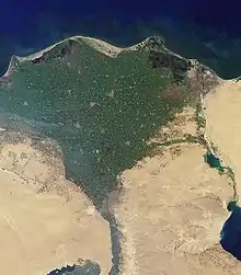 دلتا النيل هي دلتا تكونت في شمال مصر (الوجه البحري) حيث يتفرع النيل إلى فرعين يصبان في البحر المتوسط. فرع دمياط في الشرق وينتهي بمدينة دمياط وفرع رشيد في الغرب وينتهي عند مدينة رشيد. وهي واحدة من أكبر الدلتا في العالم - تمتد من بورسعيد في الشرق حتى الإسكندرية في الغرب وسميت بالدلتا لأنها تشبة المثلث. وهي تشغل مسافة مساحة 240 كيلومتر على ساحل البحر المتوسط . وتتميز الدلتا بالأراضي الزراعية الخصبة الصالحة للزراعة في أي وقت . يبلغ طول الدلتا من الشمال للجنوب حوالي 160 كم. وتبدأ الدلتا من الجنوب بالقرب من مدينة القاهرة عند القناطر الخيرية.