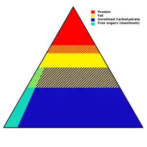 التمثيل كهرم ليس دقيق، وينطوي على اختلافات في النسب البديلة من العناصر المختلفة، ولكن الأقسام الرئيسية يمكن أن تكون ممثلة. علماً أن النسب المئوية الواردة فيه بواسطة الطاقة (جول أو سعرات حرارية) وليس عن طريق الوزن،ومن هنا السكريات البسيطة، على سبيل المثال، هي، بالتعريف، مكررة بشكل أكثر، وينبغي أن تكون أقل بكثير من 10% من كمية الطعام عند قياسها مقابل الكربوهيدرات الأخرى(تلك التي لا تزال في شكلها الطبيعي).