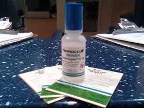 ![]() بطاقات وعبوة اختبار هيموكولت، أحد أنواع اختبار الغواياك للبراز بطاقات وعبوة اختبار هيموكولت، أحد أنواع اختبار الغواياك للبراز | |