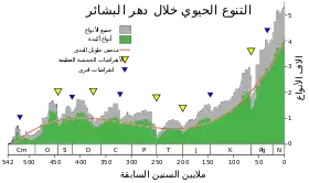 ![]() شهد دهر البشائر تنوع بيولوجي وتطور مستمر-ولكن ليست رتيبة (انظر إلى الانقراضات الجماعية المختلفة)-من الصفر لعدة آلاف من الأجناس. شهد دهر البشائر تنوع بيولوجي وتطور مستمر-ولكن ليست رتيبة (انظر إلى الانقراضات الجماعية المختلفة)-من الصفر لعدة آلاف من الأجناس. | |||||||||