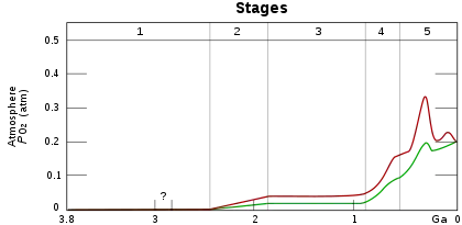 *المراحل 4 (0.85 م.س مضت وحتى الآن): يتراكم الأكسجين في الغلاف الجوي حتى يصل إلى المستوى الحالي.[6]
