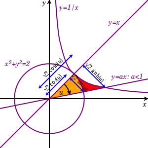 بما أن مساحة قطاع دائري له نصف قطر r وزاوية u تساوي r2u/2، ستكون مساويا لـu عندما يكون r = √2. في الرسم التخطيطي، تكون مثل هذه الدائرة مماسية للقطع الزائد الذي معادلته xy = 1 في (1,1). تمثل القطاع الأصفر والأحمر مساحة ومقدار زاوية. وبالمثل، فإن القطاعات الصفراء والحمراء معا تمثل مساحة ومقدار زاوية زائدية.