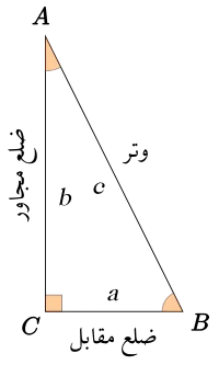يسمى الضلع المقابل للزاوية C الوتر (كما هو موضح في الشكل المقابل). عند اعتبار الزاوية A، يسمى الضلعان اللذان يشكلان الزاوية القائمة بالضلع المجاور للزاوية A (الضلع AC) والضلع المقابل للزاوية A (الضلع BC).