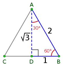 يوضح الشكل المقابل مثلثًا قائما [ملاحظة 11] يتكون من ثلاثة أضلاع a و b و c وزوايا A و B و C. الزاوية C قياسها وزاويتان أخريان حادتان ومتتامتان، بمعنى آخر، مجموع قياس الزاويتين يساوي أو π2 راديان.