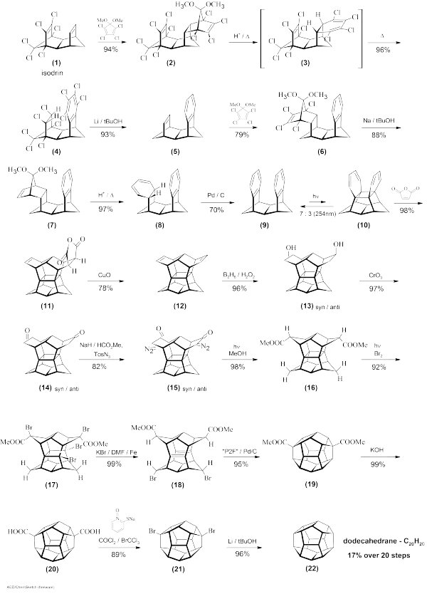 - Ternansky, Robert J.; Balogh, Douglas W.; Paquette, Leo A. (1982). "Dodecahedrane". J. Am. Chem. Soc. 104 (16): 4503–4504. doi:10.1021/ja00380a040. الوسيط