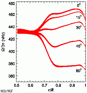 على الشمس، دراسة التذبذبات كشفت عن أن الدوران ثابت تقريبًا مع الداخل الإشعاعي ومتغير مع نصف القطر وخط العرض ضمن المغلف الحراري، الشمس لديها سرعة دوران الاستوائية 2 كم/ثانية؛ دورانها التفاضلي يعني أن السرعة الزاوية تقل مع زيادة خطوط العرض. يقوم القطبان بعمل دورة واحدة كل 34.3 يومًا، بينما يتم قياس خط الاستواء كل 25.05 يومًا، كما يتم قياسها بالنسبة للنجوم البعيدة (الدوران النجمي).