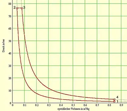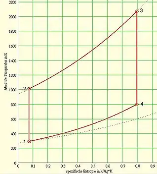 ![]() مخطط درجة الحرارة والإنتروبي (المنحنيات المنقطة تمثل عمليات متساوية الضغط) |