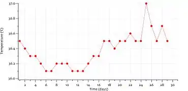 - تقوم السيدة بتسجيل درجة الحرارة يوميا على رسم بياني خاص Basal Body Temperature Chart.