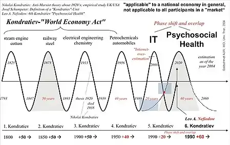 فقد بحث عالم الاقتصاد والاقتصاديات الحيوية (biostatistician) أندرياس ج جولدشميت، عن أنماط واقترح أن هناك تحولًا طوريًا وتداخلاً في ما يسمى بدورات كوندراتييف لتقنية المعلومات والصحة (كما هو موضح في الشكل باللغة الإنجليزية). وقال إن مراحل النمو التاريخية بالاشتراك مع التقنيات الرئيسية لا تعني بالضرورة وجود دورات منتظمة بشكل عام. يرى Golds chmidt أن الابتكارات الأساسية المختلفة ومحفزاتها الاقتصادية لا تستثني بعضها البعض، ولكنها تختلف في الغالب في الطول، ولا تنطبق فائدتها على جميع المشاركين في "السوق".[11]