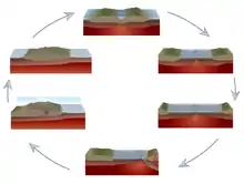 مراحل دورة ويلسون. من الساعة العاشرة في اتجاه عقارب الساعة: (10) الامتداد الأولي قبل الانجراف، (12) مرحلة الصعود إلى الانجراف، الافتتاح الأولي لحوض محيطي، (2 و 4) انتشار قاع البحر، توسيع الحوض، (6) تحريض الغلاف الصخري المحيطي، إغلاق الحوض، (8) تصادم قارة-قارة.