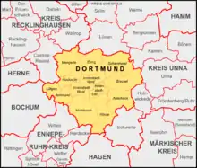 تحد دورتموند 12 مدينة اثنين منهم مدن مستقلة و 10 تابعة لمنطقة وحدودها هي المدن التالية: بوخوم، كاستروب راوكسل، فالتروب، لونن، كامين، أونا، شوارتي، هاغن، هيدريك وويتن وتعتبر دورتموند جزء من ويسفاليا وتحديداً تقع في شمال الراين-وستفاليا وأيضاً هي جزء من خليج وستفاليا