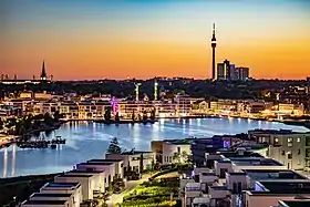 قاعة المدينة القديمة، مسرح دورتموند، قاعة الاحتفالات، برج U، بحيرة فينيكس بها: برج فلوريان (يمين) وسيغنال إيدونا بارك (يسار) | ||||||||