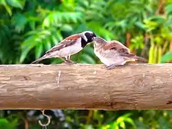 عصافير الدوريّ في العالم القديم. تنتمي إلى فصيلة الطيور الحباكة نفسها. وهي تشقشق أكثر مما تطلق أغاني حقيقية. وفي الشتاء، تكوِّن أسرابًا كبيرة. وتتغذى هذه العصافير بحبوب الحشائش، ومنها محاصيل الحبوب. والعصفور المنزلي الدوري أكثر عصافير العالم القديم شهرة. وهو ينمو ليصل إلى 16سم طولاً. ويبني عشه تحت طنف المنازل (ذلك الجزء من السقف الذي يبرز من الحائط). ويعتقد أن العصفور المنزلي نشأ في وسط إفريقيا، وانتشر عبر وادي النيل إلى البحر الأبيض المتوسط ومن هناك انتشر شمالاً. وهو يوجد الآن في مناطق شبه متجمدة. وقد أدخل الناس العصافير المنزلية إلى أجزاء أخرى من العالم من بينها أستراليا ونيوزيلندا وشمالي أمريكا. وتبني العديد من الأنواع الأخرى من العصافير عادة أعشاشها في طنف (إفريز) المباني.