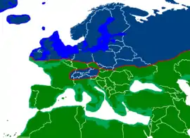 خريطة توضِّح امتداد المنطقة القطبية المتجمِّدة (باللون الأزرق) خلال الفترة الجليدية الأخيرة بأوروبا.